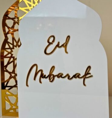 2-in-1 Ramadan Mubarak & Eid Mubarak Acrylic Sign – White and Gold