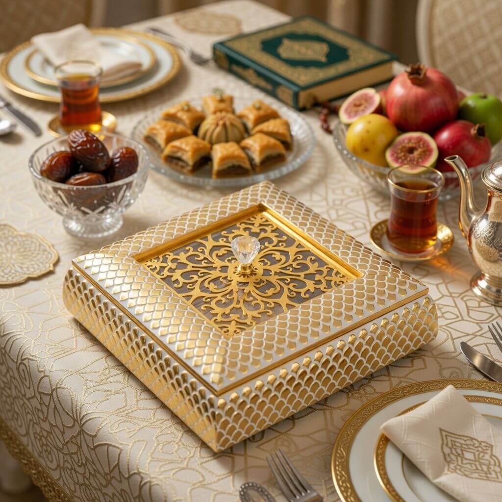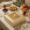 This elegant Gold and White Square Tray with Acrylic Lid features an intricate floral cut-out design on the lid, complemented by gold handles. The exterior showcases a textured scale pattern, adding a regal touch. Ideal for storing sweets, dry fruits, or jewellery, this exquisite piece combines functionality with sophistication, making it a perfect addition to any luxury collection.