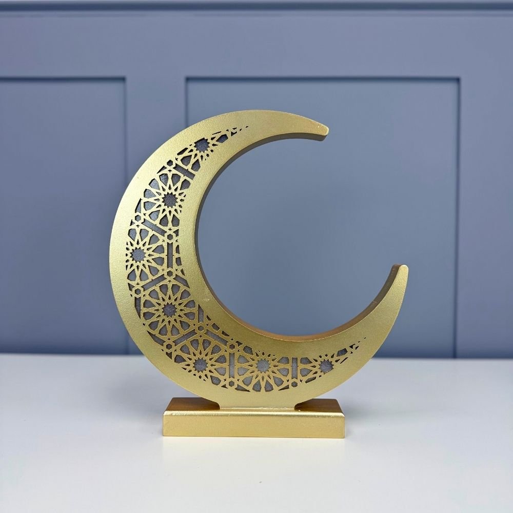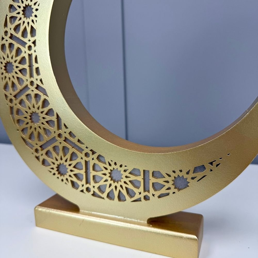 Illuminate your space with the Gold Light up Moon Crescent Decoration. Crafted from wood, this elegant piece features a crescent moon design with a beautifully detailed mosque at its center. Warm LED lighting inside creates a soft, inviting glow, making it a perfect addition to your home décor, Ramadan, or Eid celebrations.