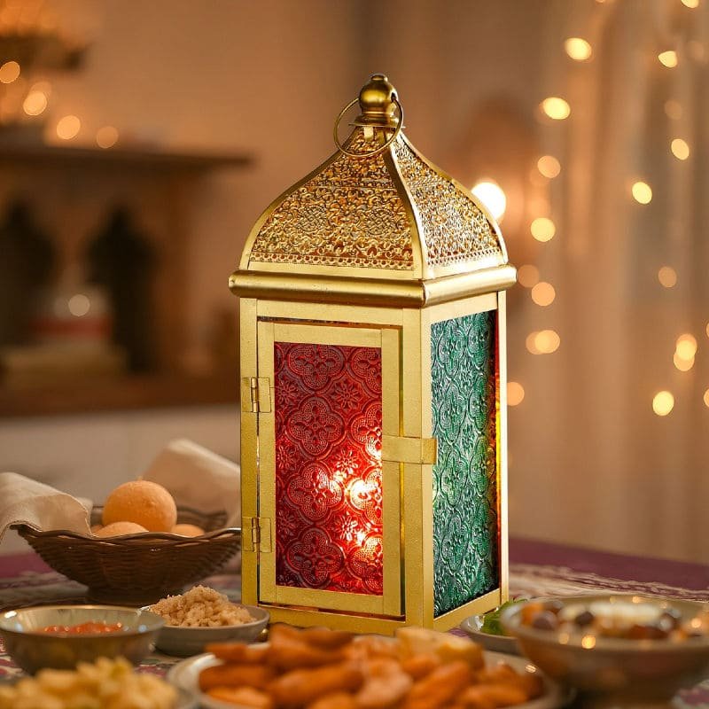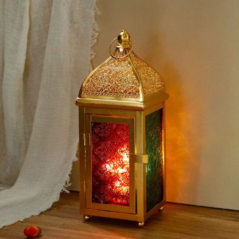 Elegant Vintage Ramadan Lantern – An intricate metal frame and tempered glass, this Gold Moroccan Styled Lantern with Colourful Glass blends traditional Arabian design with timeless charm, perfect for Ramadan, Eid, or everyday decor.