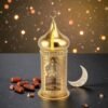 Design: Ornate gold metal body with detailed cutwork, finished with a dome and crescent moon for a classic Islamic look