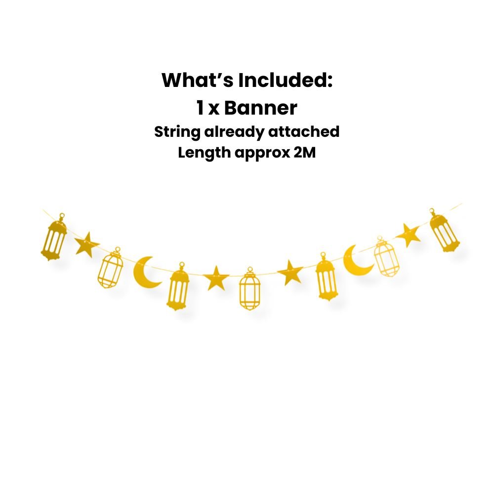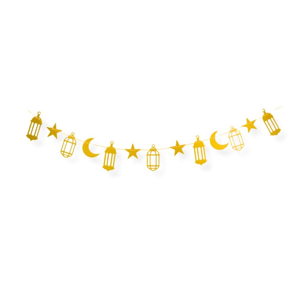 Add a festive and elegant touch to your home with this beautiful gold Ramadan and Eid lantern banner. Featuring classic Islamic symbols, this banner is perfect for decorating throughout the holy month and for Eid celebrations.