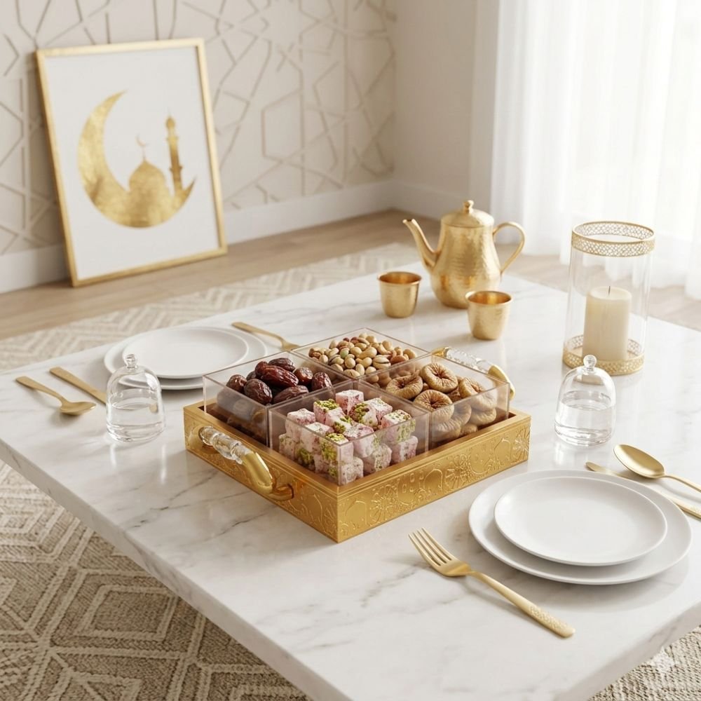 Celebrate Ramadan, Eid, or any special occasion with this elegant Gold Snack Serving Tray with 4 Compartments. It features four separate compartments in a clear acrylic box with floral lids, framed by gold sides adorned with mosque-inspired Islamic patterns. Two gold handles make serving effortless, combining functionality with sophisticated style.