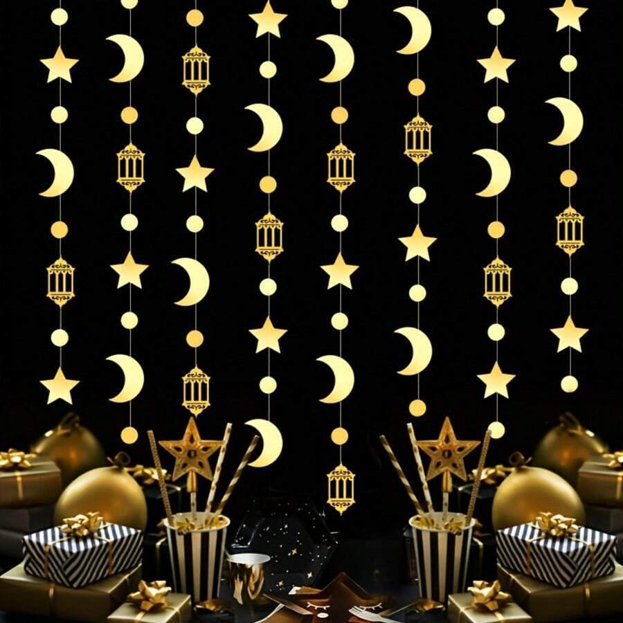 Add a festive touch to your home with this pack of 5 Hanging Card Decorations for Ramadan and Eid, each measuring 2 metres in length. Every string features beautifully designed lantern, crescent moon, and star cards—perfect for creating a warm and joyful atmosphere during Ramadan and Eid. Ideal for walls, windows, and party setups.
