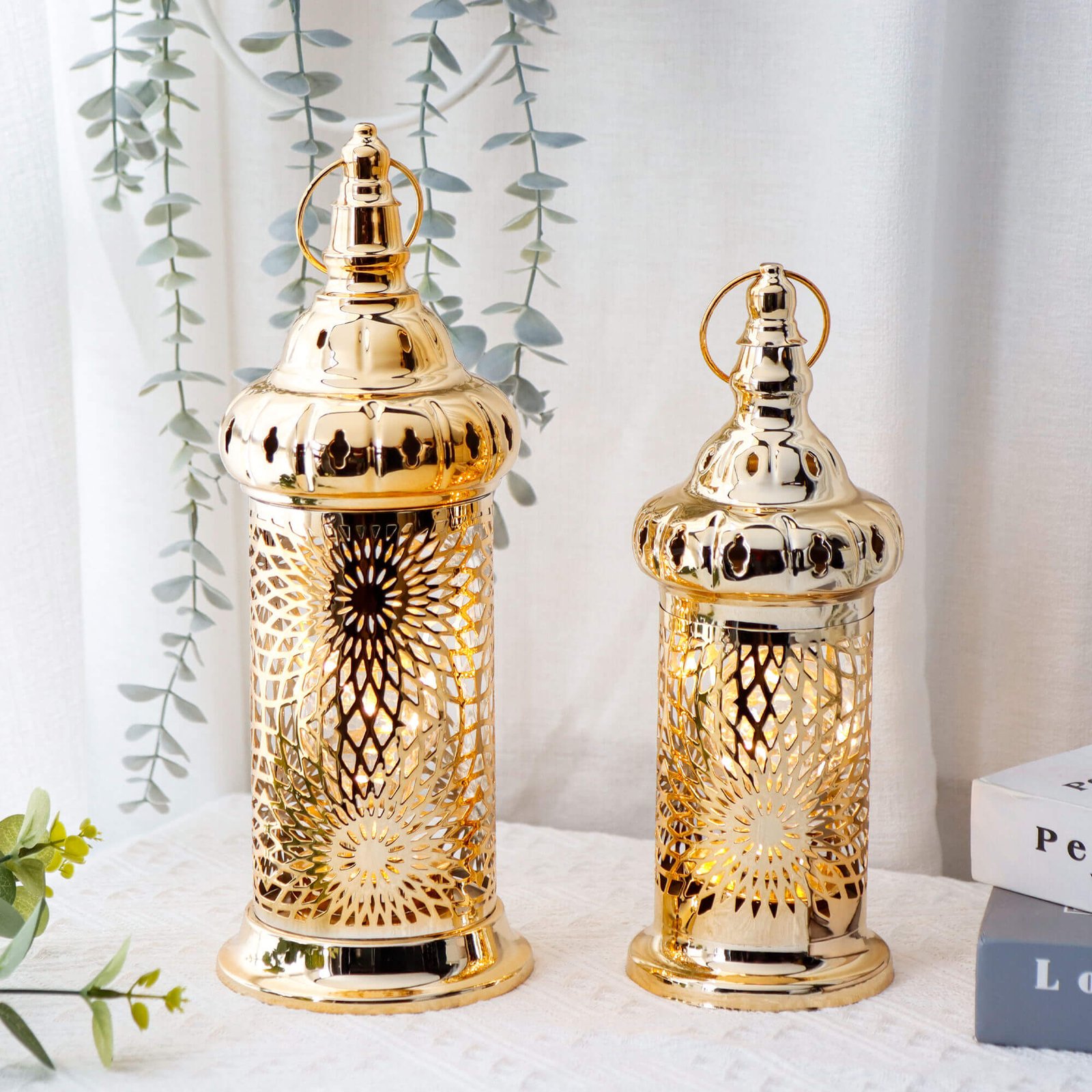 EXQUISITE RAMADAN DECOR – The Moroccan Chrome Gold Lanterns with LED features a polished gold finish and intricate laser-cut patterns, creating a stunning light and shadow effect. Inside, an LED fairy light string adds modern charm..