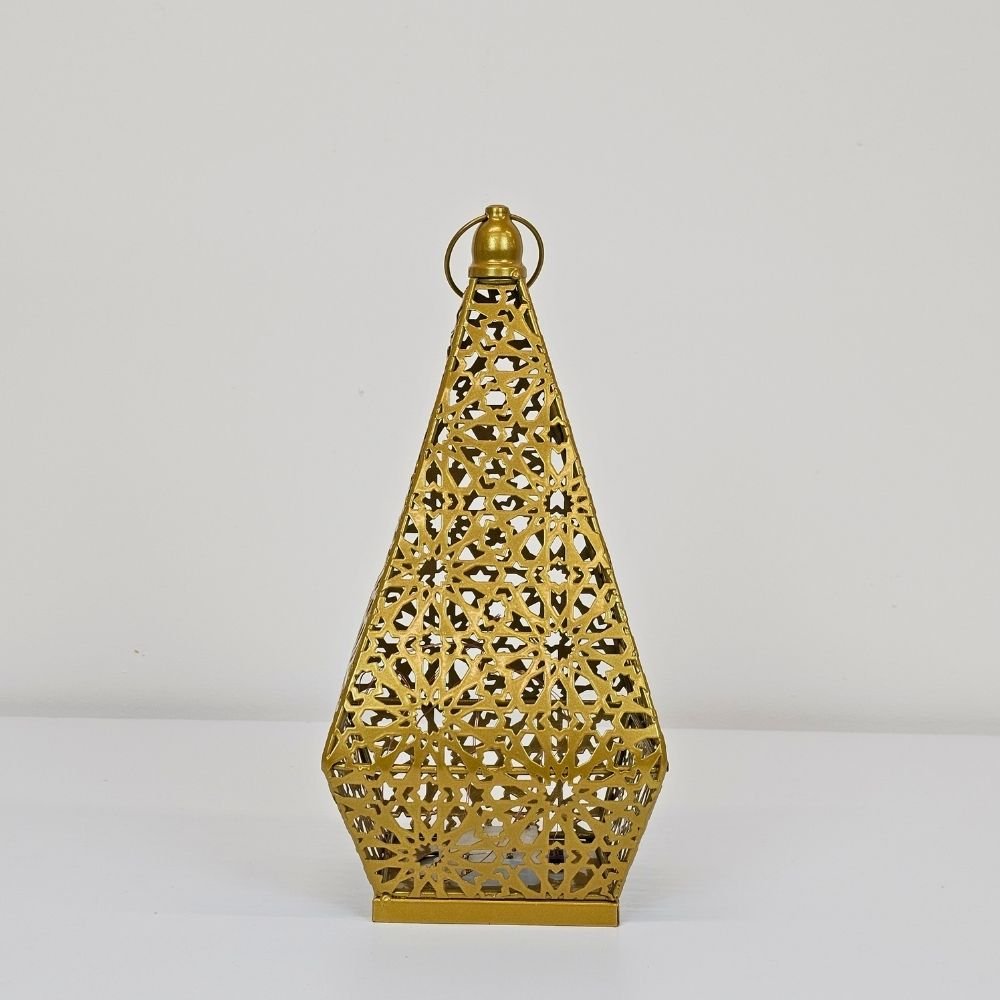 Add a warm, magical glow to your Ramadan and Eid décor with these beautiful Moroccan Pyramid Styled Gold Lanterns with LED. Crafted from metal with an elegant gold/brass finish, their intricate geometric cut-out patterns create stunning shadow effects when illuminated, perfect for setting a peaceful and festive atmosphere during the holy month.