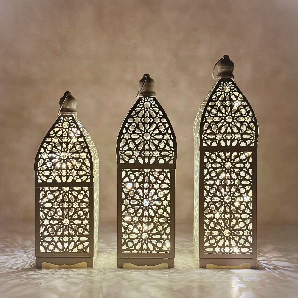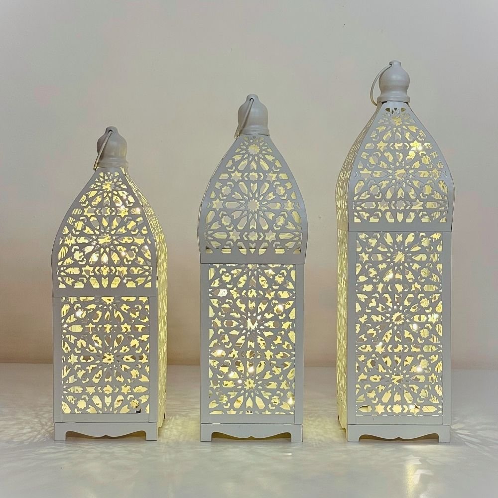 Add a touch of Moroccan elegance to your home with these Moroccan Style White Lanterns with LED, featuring intricate patterns and a warm LED glow. Perfect for Ramadan, festive décor, or cosy ambient lighting, it combines traditional charm with modern convenience.