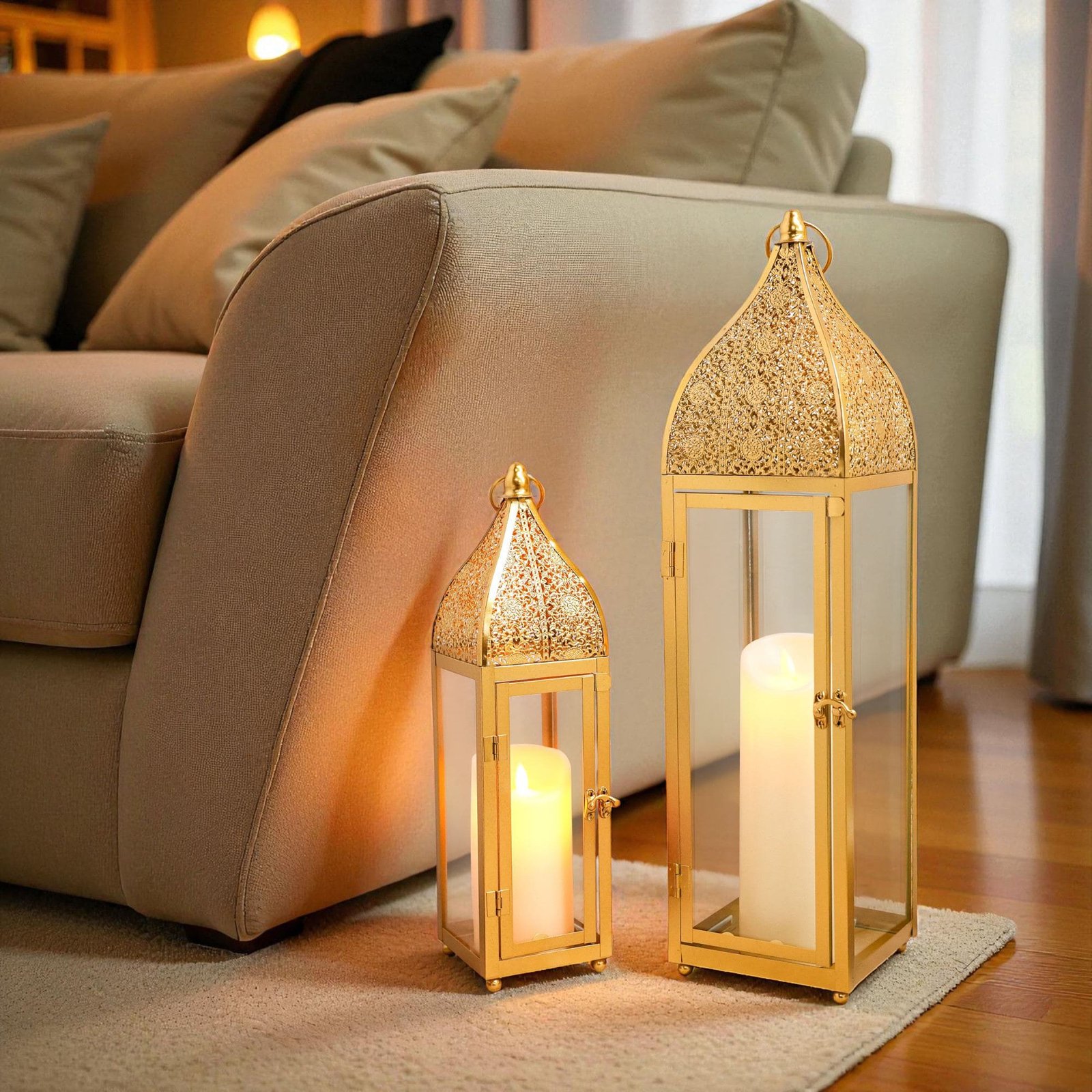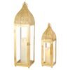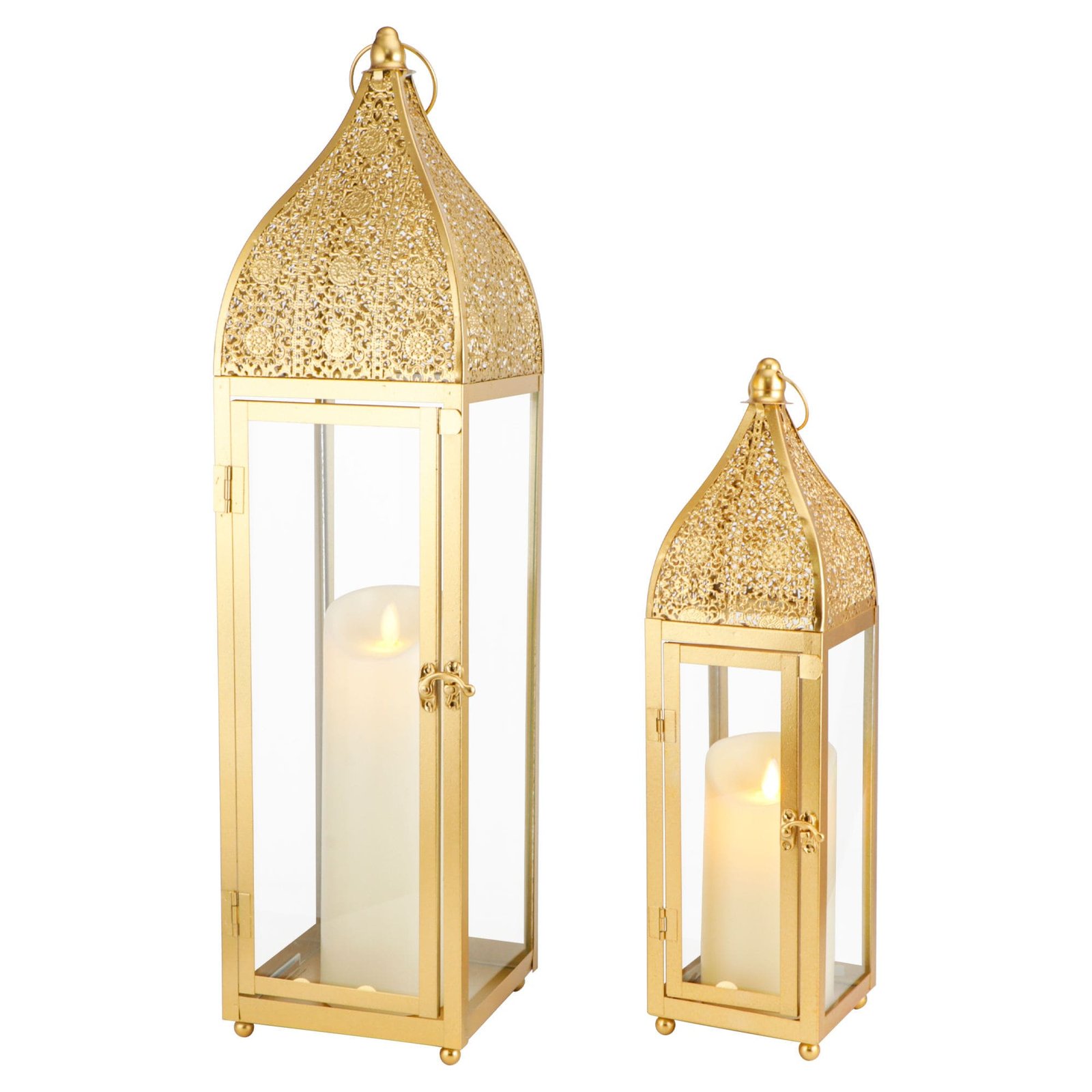Set Of 2 Gold Elegant Islamic Moroccan Lantern Set – Features intricate geometric cutout patterns and a luxurious gold finish, casting a warm, spiritual glow perfect for Ramadan and Eid décor.