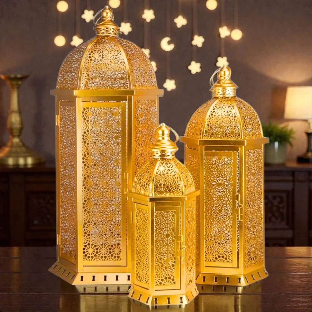 Set of 3 Moroccan-Style Gold Lanterns – Elegant gold metal candle lanterns with Islamic-inspired detailing, creating a warm and spiritual ambiance perfect for Ramadan and Eid décor.